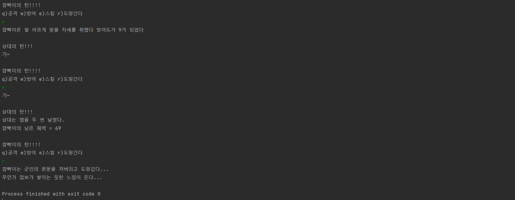while 1: # 주인공의 행동 패턴 print(f"\n{나}의 턴!!!!") time.sleep(1) N = input("q)공격 w)방어 e)스킬 r)도망간다\n") if N == "q": print(f"{나}은/는 잽을 두 번 날렸다.") 공격력1 = 공격력 + random.choice([1, 2, 3, 5, 8]) if 공격력1 - 적방어력 <= 0: print("공격은 완전히 복부로 흡수돼 방어됐다...") 적방어력 -= 공격력1 else: 적체력 -= (공격력1 - 적방어력) print(f"상대방의 남은 체력 = {적체력}") 적방어력 = 0 elif N == "w": 방어력 += 5 + 정신력 print(f'{나}은 덜 아프게 맞을 자세를 취했다 방어도가 {방어력}가 되었다') elif N == "e": 기 += 1 print("기~") if 기 == 2: print(f"{나}의 어퍼컷!") 적체력 -= 정신력 + random.choice([10, 15, 20, 25, 30]) print(f"상대방의 남은 체력 = {적체력}") 기 = 0 elif N == "r": escape = random.random() if escape < 운/10: print(f"{나}는 군인의 본분을 져버리고 도망갔다... \n무언가 업보가 쌓이는 듯한 느낌이 든다...") 도주 += 1 break else: print("도망에 실패했다!!!") if 적체력 <= 0: print(f"거울 속의 {나}: 쳇, 이번에도 글렀나.") breakwhile 1: