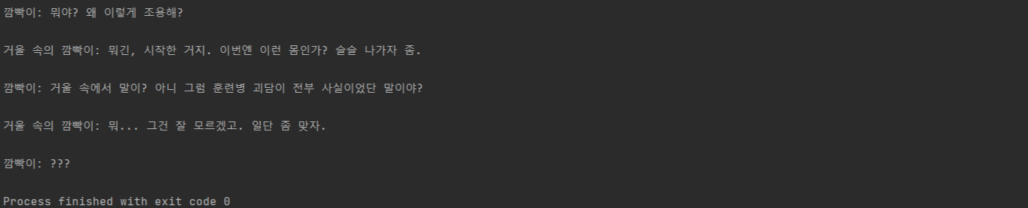 input(f"\n{나}: 뭐야? 왜 이렇게 조용해?") input(f"\n거울 속의 {나}: 뭐긴, 시작한 거지. 이번엔 이런 몸인가? 슬슬 나가자 좀.") input(f"\n{나}: 거울 속에서 말이? 아니 그럼 훈련병 괴담이 전부 사실이었단 말이야?") input(f"\n거울 속의 {나}: 뭐... 그건 잘 모르겠고. 일단 좀 맞자.") input(f"\n{나}: ???")자세히 설명하면, 이스케이프 코드 \n(줄바꿈 기호로 약속되어 있음)을 이용해 문장이 다닥다닥 붙어 있지 않도록 했다. f 포맷팅 기법을 이용하여 앞서 설정해 두었던 캐릭터명을 출력했다. 아래는 실제 출력 화면이다.
